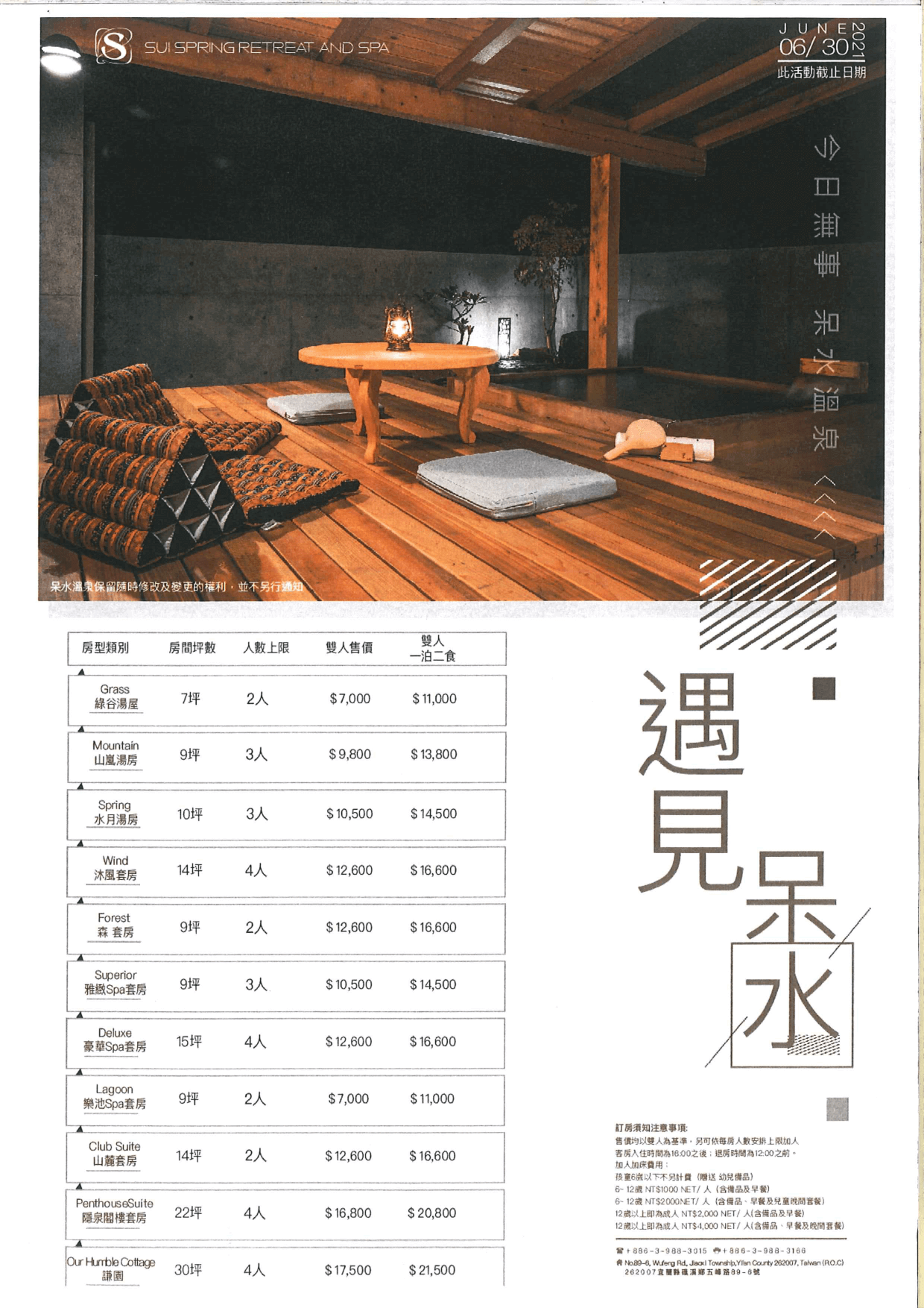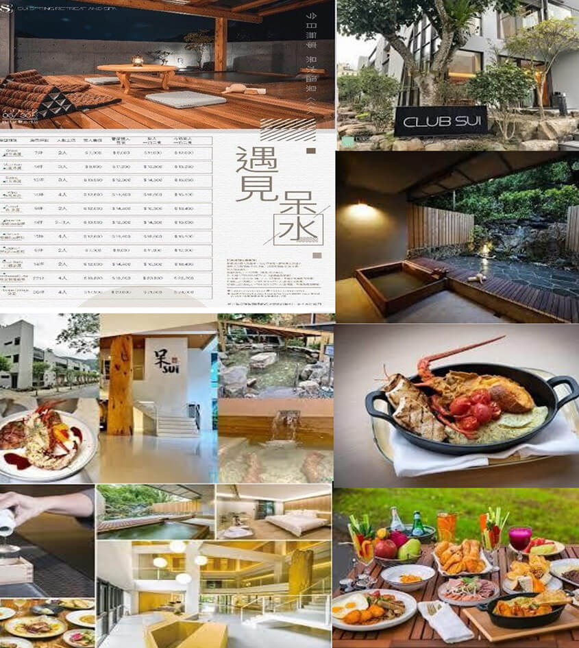 「呆水溫泉」(Sui Spring Retreat & Spa)是宜蘭礁溪地區最新落成的溫泉品牌,也是目前礁溪地區最難訂的溫泉飯店。它結合了泡湯、餐飲、觀光度假、SPA、親子、健身和休憩空間,公共設施包 含三種不同溫度的大眾湯、24 小時免費零食自助吧、健身房、兒童遊戲區、Sui Salon 選品店、懷舊風味美桃冰室等等,座落在風景區旁邊所以幅員廣大、視野遼闊。整體設計風格讓人宛如置身京都的復古氣息,外牆的清水模結構佐以充滿禪風的實木內裝、Lobby 的挑高設計輔以落地窗灑進來的陽光、廳內矗立著 3 公尺高紅檜裝飾搭配周邊各式原木藝術,完全可以讓人跳脫城市喧囂,靜靜享受宜蘭的慢活步調。該飯店主打一泊二食,料理呈現更是令人備受尊榮寵愛,用餐形式分為套餐、單點及半自助式,主打原木燒烤及台義法之創意料理,晚上不僅可以享受各式龍蝦、Prime 牛排、伊比利豬及鮑魚; 早餐更是豐盛到可以直接嚐盡充滿鮮甜海味的龍蝦海鮮粥,還有「炭烤穀飼 100 天肋眼牛排襯太陽蛋」, 恰恰好的熟度、酥脆的馬鈴薯塊配上鮮豔時蔬,最後再喝上一杯現打蔬果汁,可說是一大享受呢!