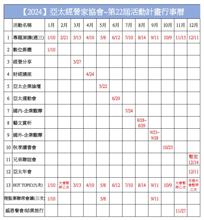 2024年度-亞太第22屆例會活動計畫行事曆